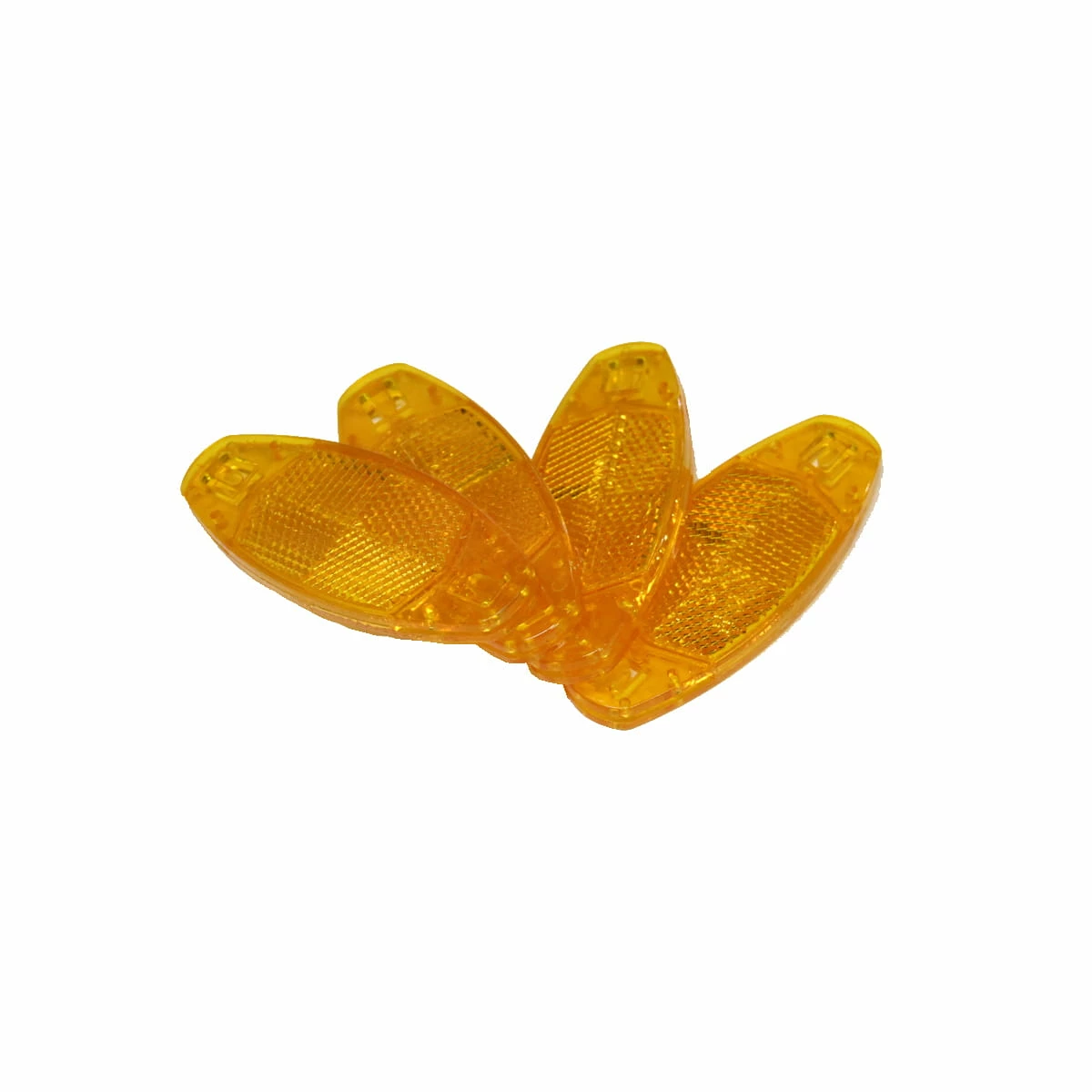 Les réflecteurs de rayons commerciaux approuvés par le StVZO / les yeux de chat à »cliquer » sur les rayons. Avec un cran de sécurité, pour qu’ils adhèrent mieux aux rayons et ne se perdent pas.